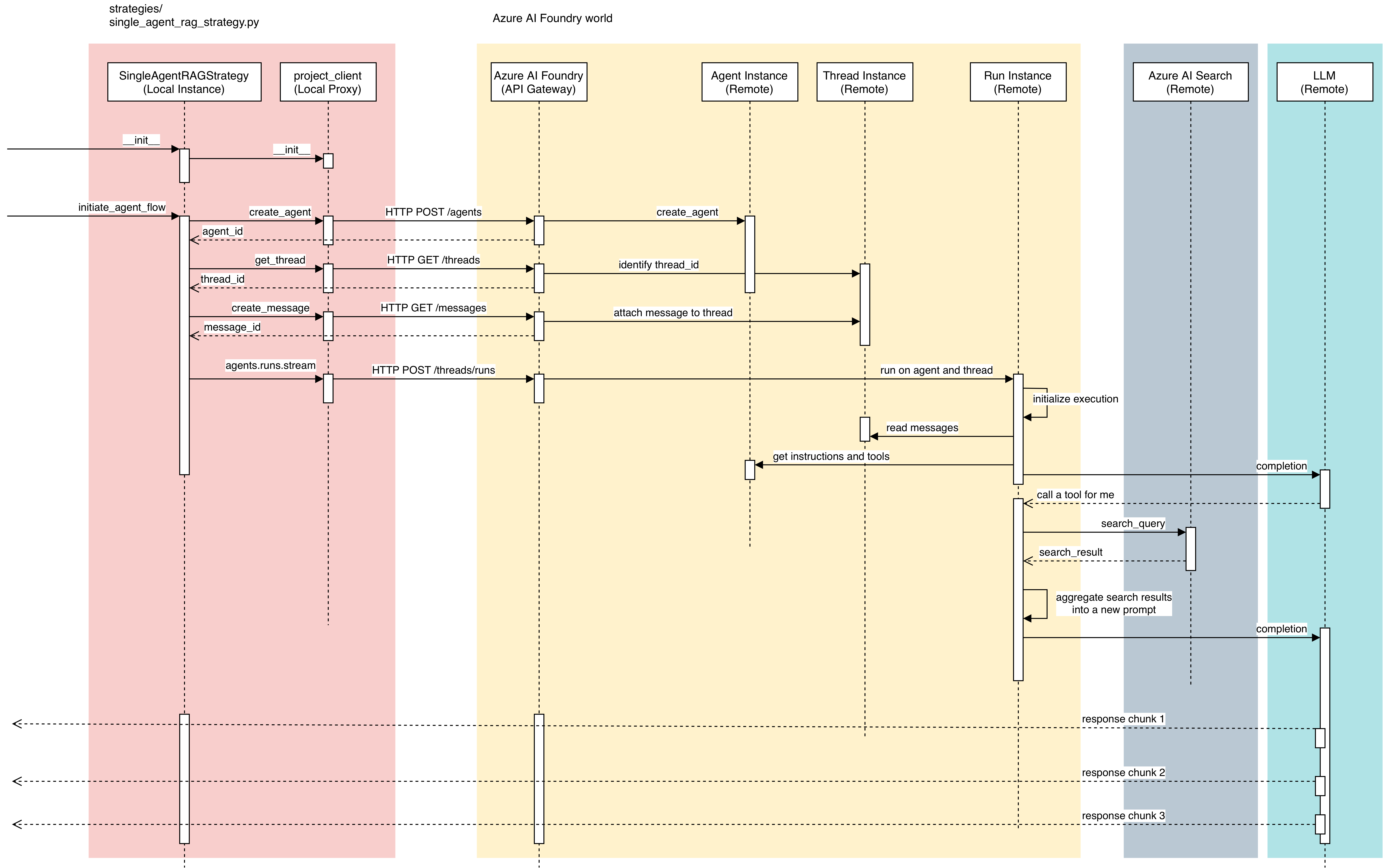 The strategy object instantiated from the SingleAgentRAGStrategy class runs in the container app and controls the sequence of activities behind the AI Foundry wall. It uses the project_client object as a local proxy (think of it as a remote TV control) to orchestrate operations. The strategy object doesn't handle grounding or LLM calls directly—these are delegated to the AI Foundry agent where the entire RAG pattern is executed.