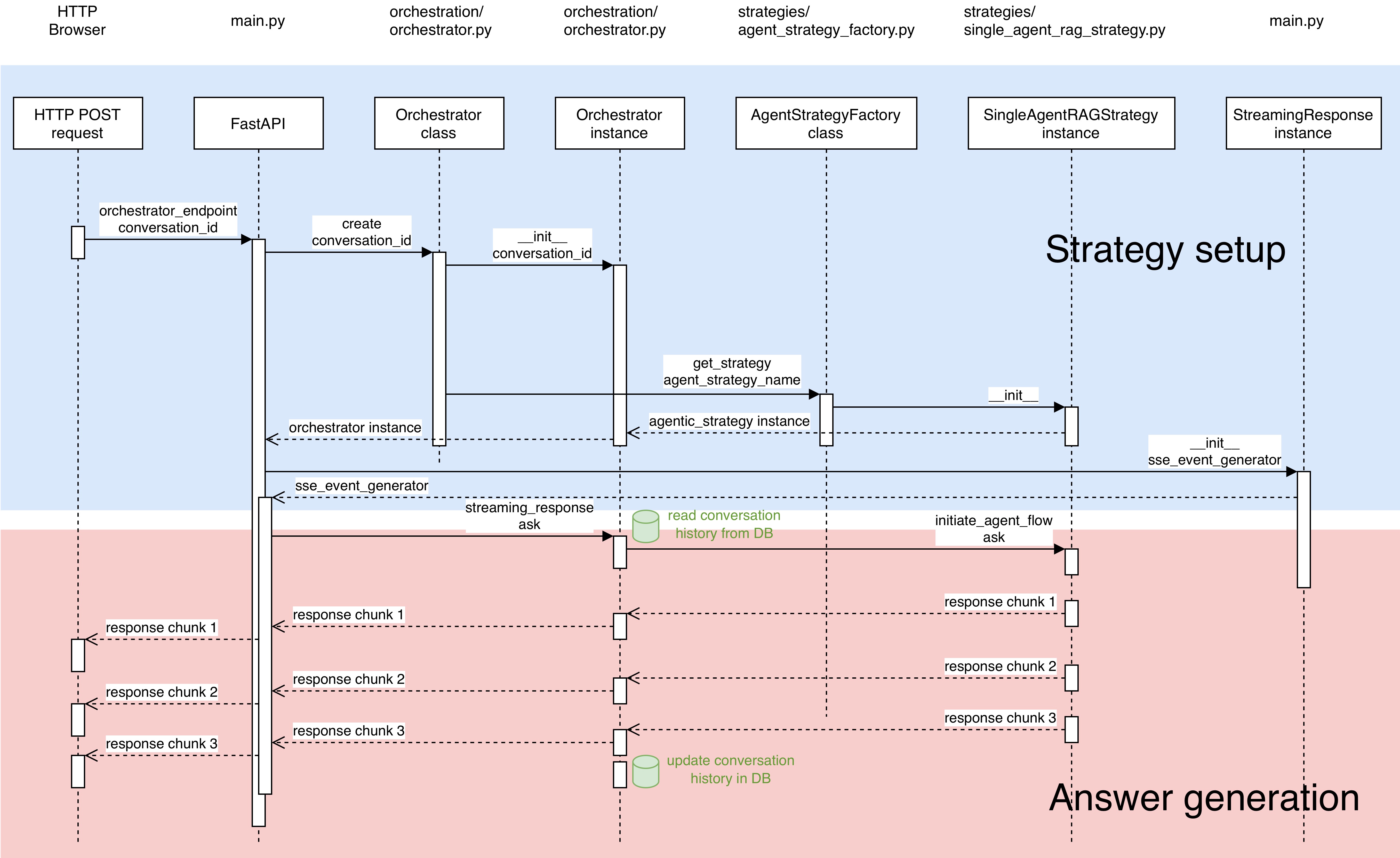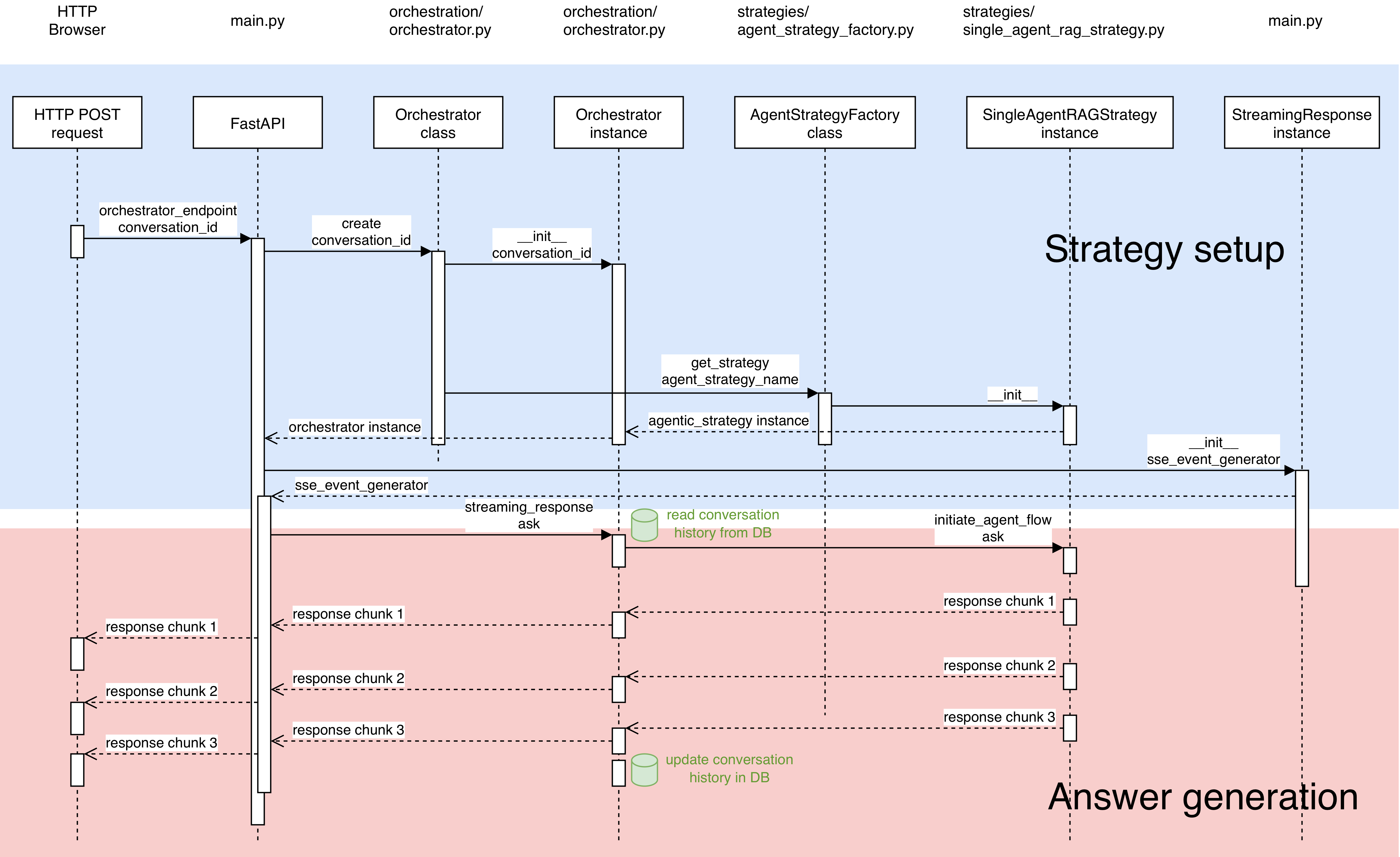 This section explores how the Single-Agent RAG Strategy orchestrates the entire request-response lifecycle, from receiving a user's question to delivering a grounded, streamed answer. The diagrams below illustrate the conversation lifecycle, state management, and the interaction between the Orchestrator container app and AI Foundry services.