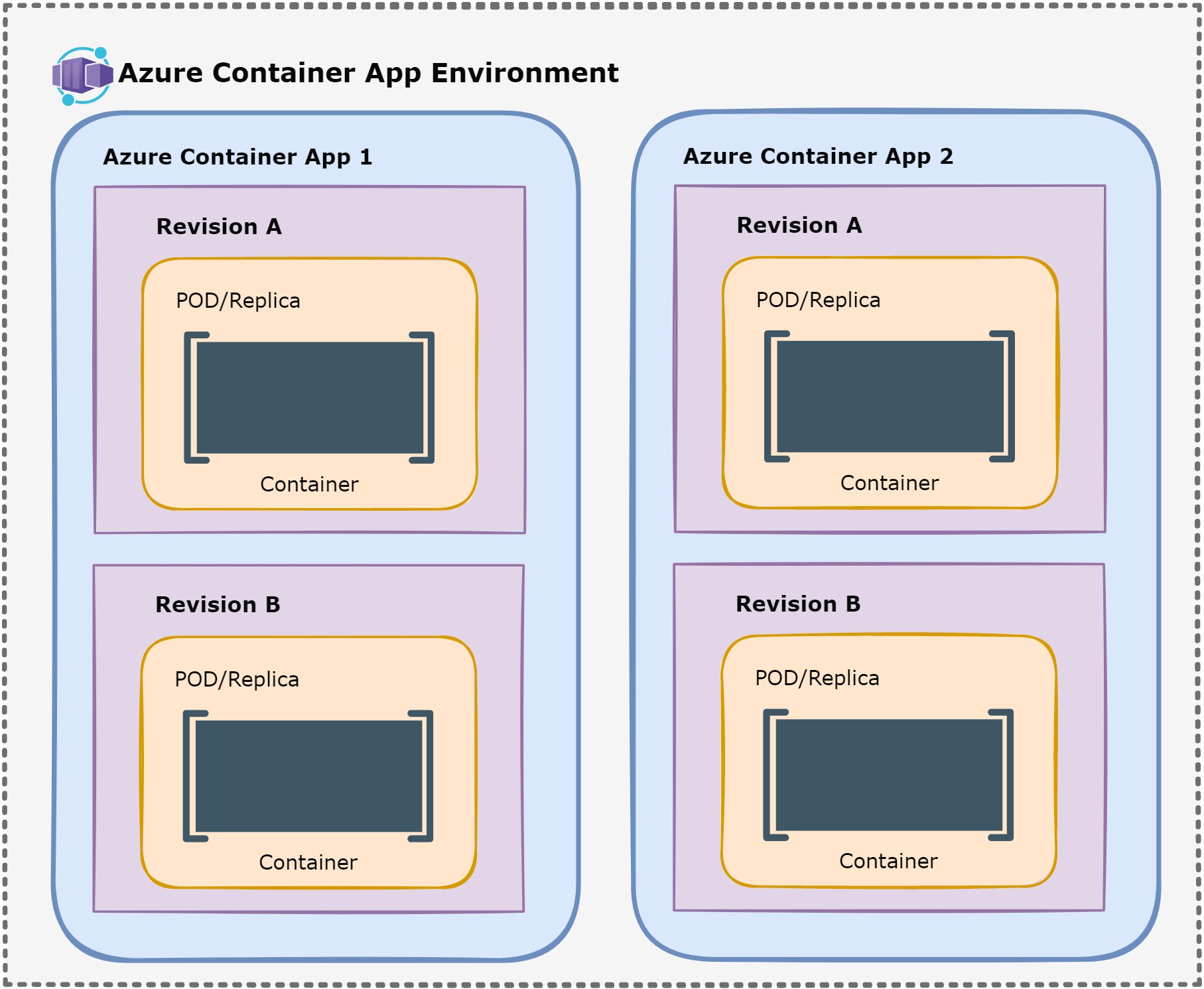 Containers Containers in the Azure Container Apps are grouped together in pods/replicas inside revision snapshots. A pod/replica is composed of the application container and any required sidecar containers. Containers can be deployed from any public or private container registry, and they support any Linux-based x86-64 (linux/amd64) images. At the time of creating this workshop Windows based images are not supported.