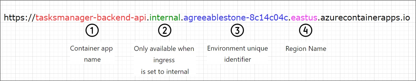 When you do this change, the FQDN (Application URL) will change, and it will be similar to the one shown below. Notice how there is an Internal part of the URL. https://tasksmanager-backend-api.internal.[Environment unique identifier].eastus.azurecontainerapps.io/api/tasks/