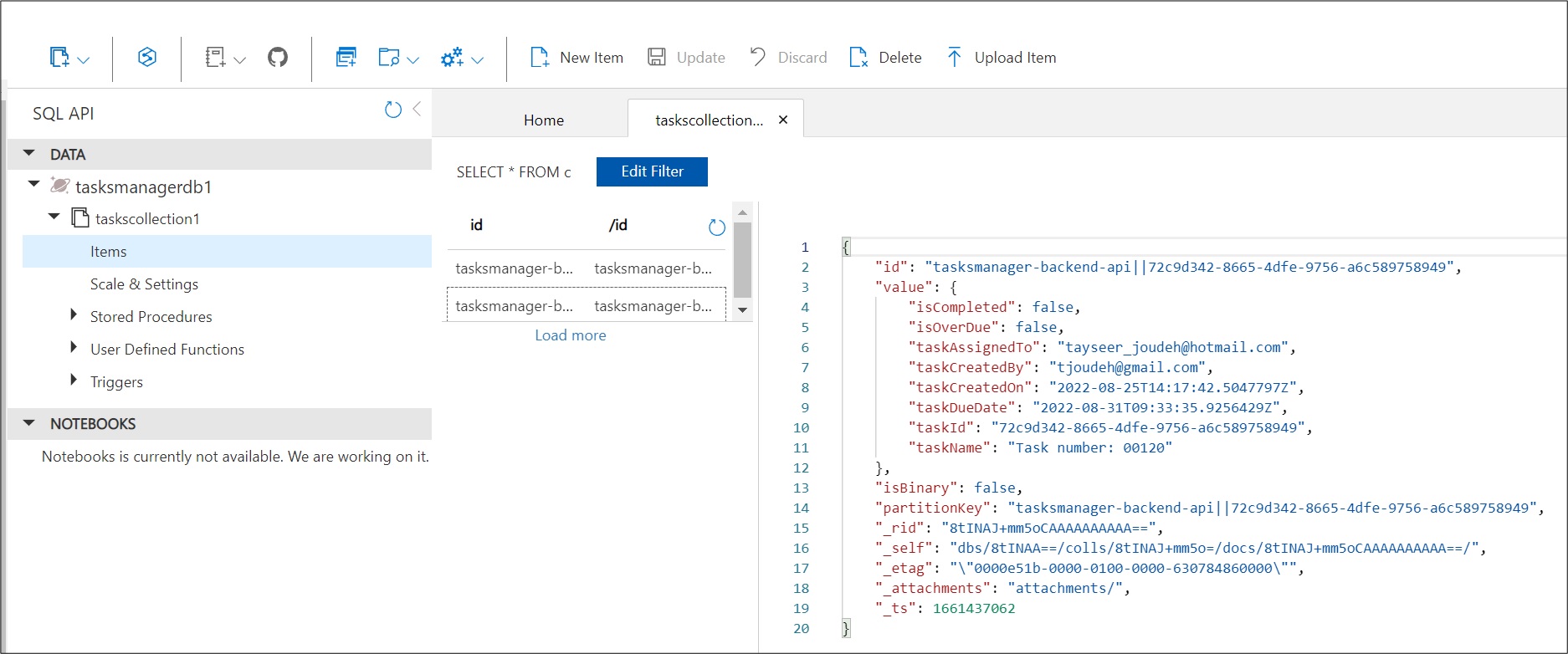 After creating a new record you can navigate to the Data explorer on the Azure portal for the Azure Cosmos DB account. It should look like the image below: