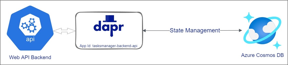 Whereas in the previous section we demonstrated using Dapr State Store without code changes, we will now introduce a change on the Backend API and create a new service named TasksStoreManager.cs which will implement the interface ITasksManager.cs to start storing tasks data on the persist store. Locally, we will start testing with Redis, then we are going to change the state store to use Azure Cosmos DB.