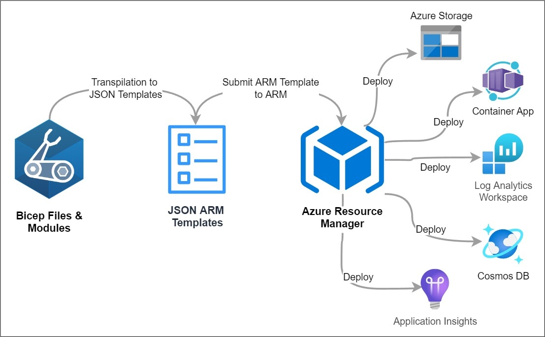 Within Azure there are two ways to create IaC. We can either use the JSON ARM templates or Bicep (domain-specific language). As a project grows and the number of components and dependencies increases, working with JSON ARM templates in real-world scenarios can become increasingly complex and difficult to manage and maintain. Bicep provides a more user-friendly and straightforward experience when compared to ARM templates, resulting in increased productivity. However, it's worth noting that Bicep code is eventually compiled into ARM templates through a process called "transpilation."