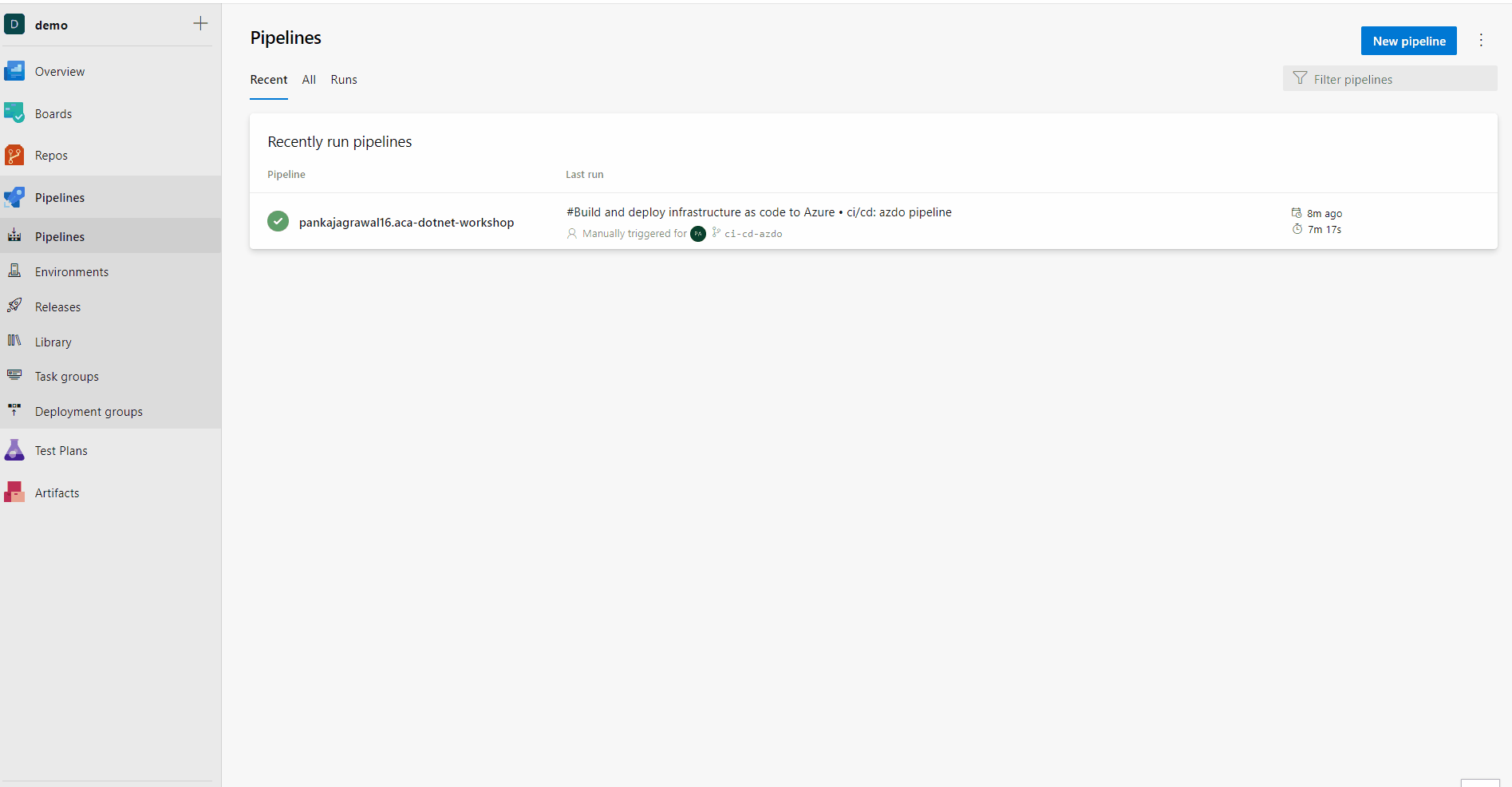 The workshop repository contains a Azure Devops Pipeline yaml file that will be used to deploy the infrastructure components of our application. Follow the steps below to create a devops pipeline to deploy the infrastructure components of our application.