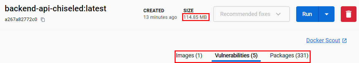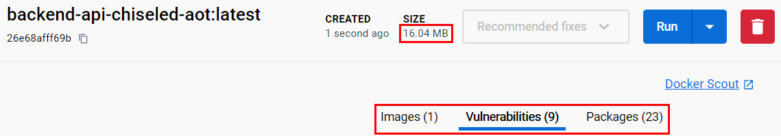 This image is comprised of one image, just 23 packages, and has nine vulnerabilities.