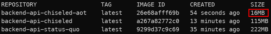 While the image is vastly reduced, what hasn't changed is the functionality of the API. Whether you are executing it locally or deploying to Azure, the Backend API will continue to function as it always has. However, now it has less vulnerabilities, less time to transfer from the registry, less startup time, and less of a memory footprint. Furthermore, 16 MB is the uncompressed image. With compression, we are likely to continue dropping in size.