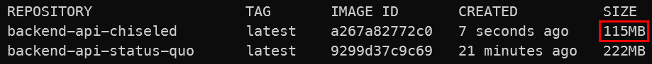 Create a new file, Dockerfile.chiseled in the Backend Api root directory, then build the image again: