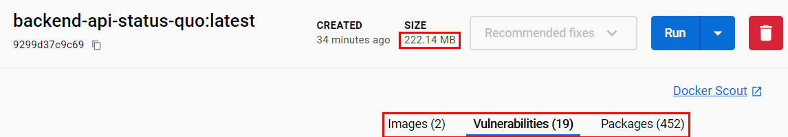 This image is comprised of two images, 452 packages, and has 19 vulnerabilities.