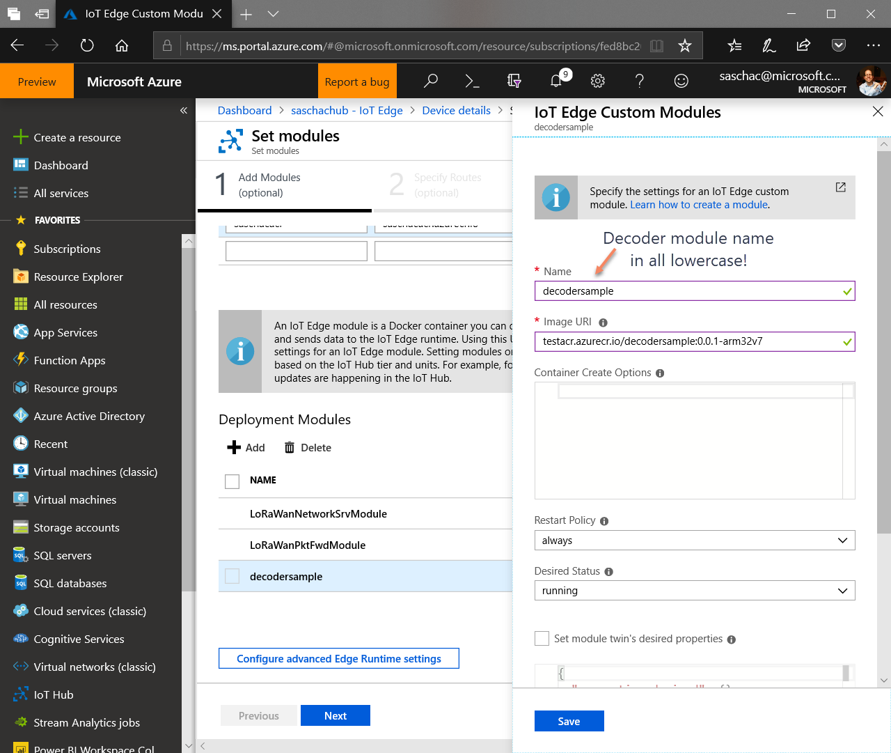 To activate the decoder for a LoRa device, navigate to your IoT Hub → IoT Devices → Device Details → Device Twin and set the ```SensorDecoder``` value in the desired properties to: