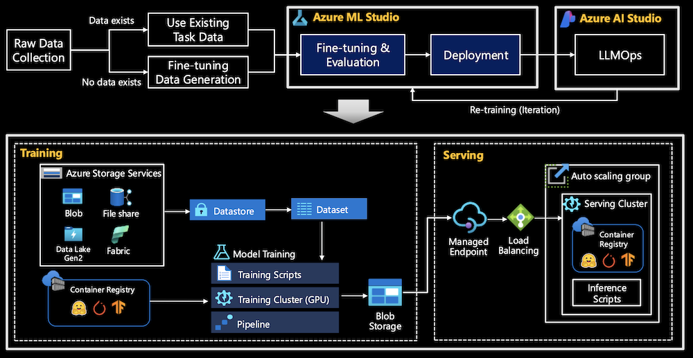 - Training Cluster: Azure manages the training resources, ensuring that scalable GPU clusters are available to fine-tune models effectively.