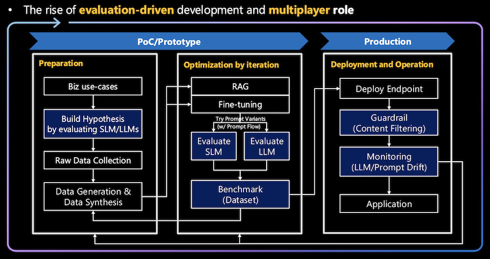 - Once a model is chosen, it goes through fine-tuning and prompt flow variations, and these variations are evaluated after each iteration. This evaluation-driven cycle helps ensure that the fine-tuning process is not just guesswork but based on data and performance metrics from each iteration.