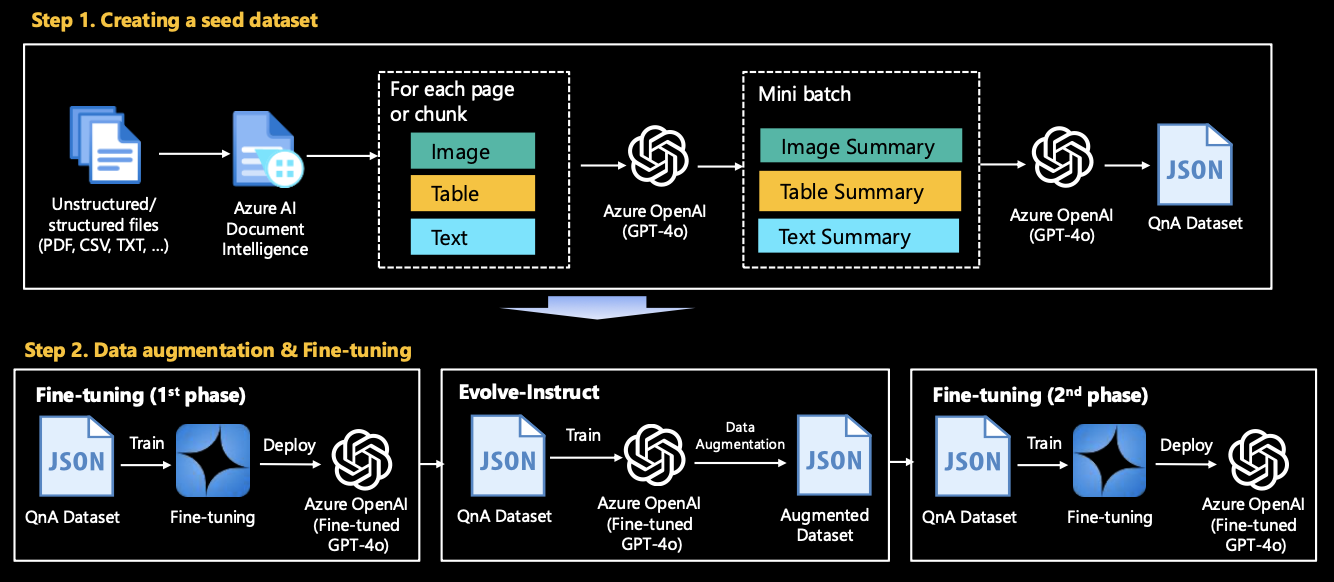 The task is to preprocess and convert this heterogeneous data into a structured format suitable for fine-tuning or RAG. This involves extracting and cleaning text from various file formats, converting tables and images to text using Azure AI Services if necessary. This dataset is used as a seed dataset for fine tuning or RAG and is used as a baseline to improve the performance of domain-specific use cases.